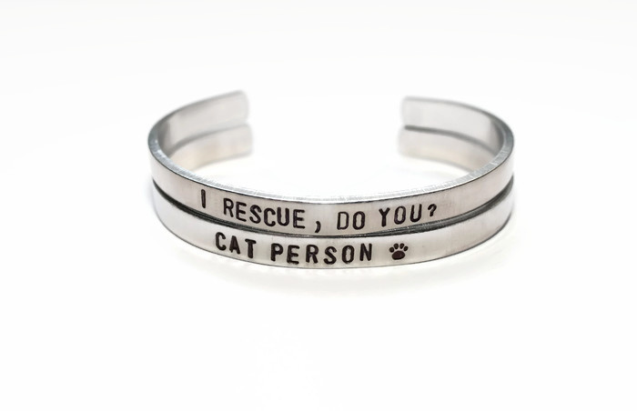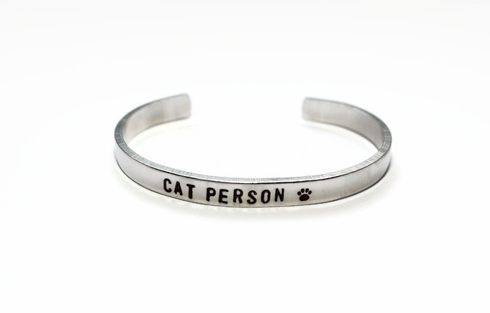 Stack them or wear them alone these bracelets are light weight and fun to wear! Simply stamped, Cat Person with a paw print and made with 12 gauge polished aluminum 1/4″ wide also, includes our signature N&B logo.