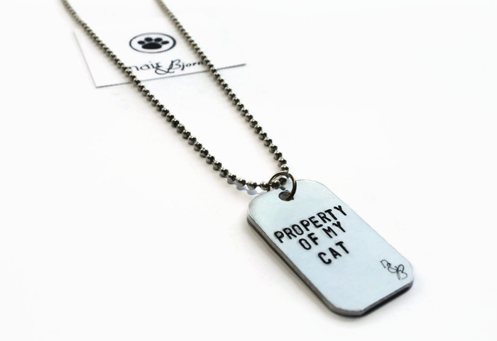 This unisex necklace is the perfect accessory for the animal lover who is passionate about their cat. The dog tag is tumbled to a beautiful shine and is stamped with the phrase, “Property of my Cat.” The pendant is a 14 gauge aluminum dog tag that is approximately 1 1/2″ x 7/8″ and is attached to a stainless steel ball chain that measures 30″.
